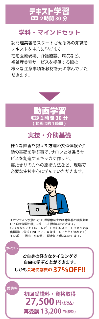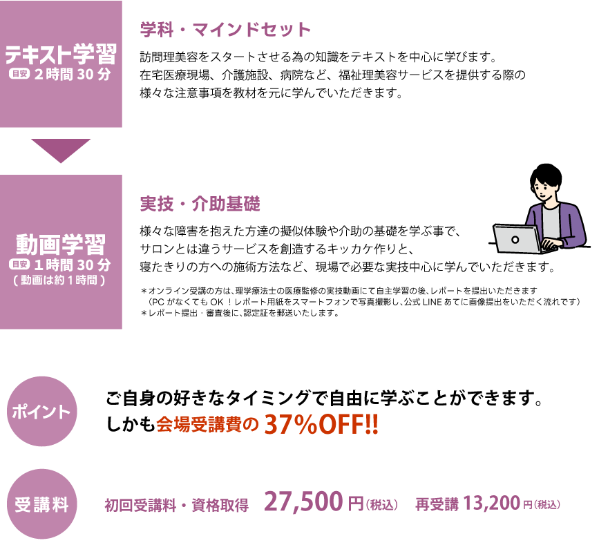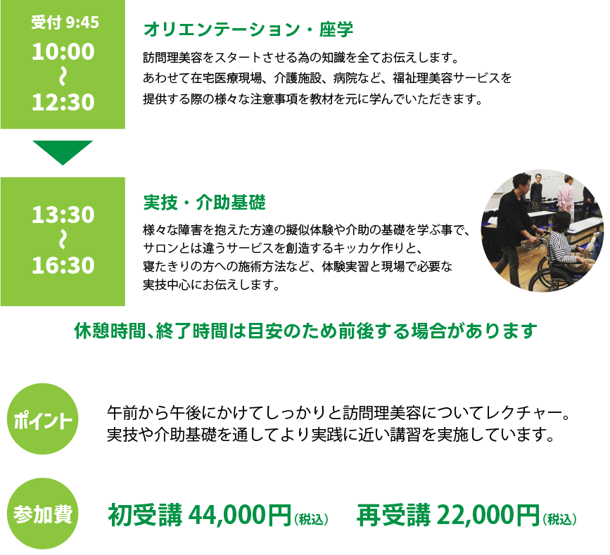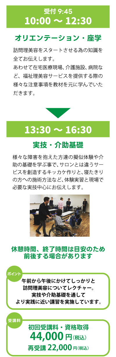 ◎オリエンテーション・座学 訪問理美容をスタートさせる為の知識を全てお伝えします。 あわせて在宅医療現場、介護施設、病院など、福祉理美容サービスを提供する際の様々な注意事項を教材を元に学んでいただきます。 |